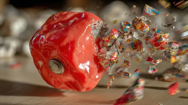 Red glossy cube breaking apart into colorful fragments in motion