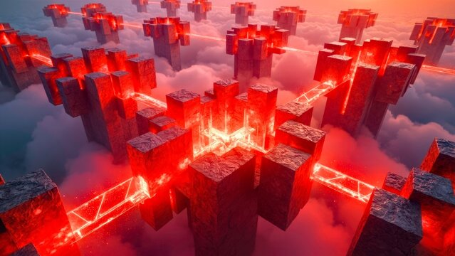 Earth inside digital tunnel with red glowing squares, global technology network theme