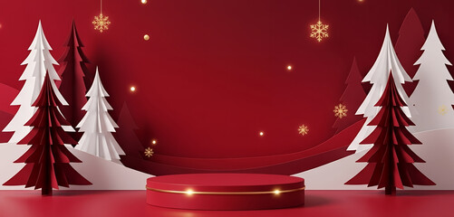 Minimalist Christmas background featuring a red gradient backdrop, 3D podium, golden ribbon, and ornaments. Ideal for holiday branding and seasonal design.