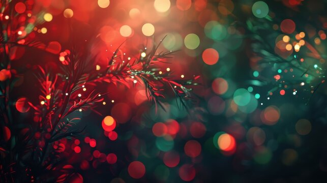 A close-up image of a single evergreen branch silhouetted against a background of blurry red and green holiday lights. The lights create a warm, festive atmosphere, and the evergreen branch adds a tou