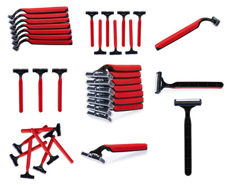 A vintage safety razor, a shaving stone, and a modern disposable razor rest on a textured surface, displaying diverse grooming tools.