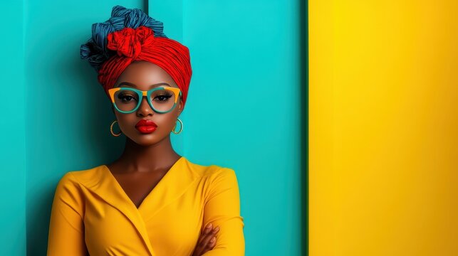 A stylish woman stands against a vibrant background wearing a red headwrap and chic glasses, blending fashion with art, and expressing boldness and confidence.