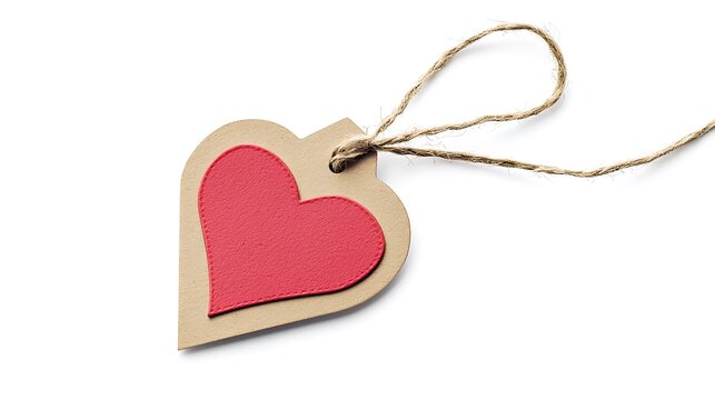 A vibrant red heart made of wood is suspended from a delicate string against a plain white backdrop