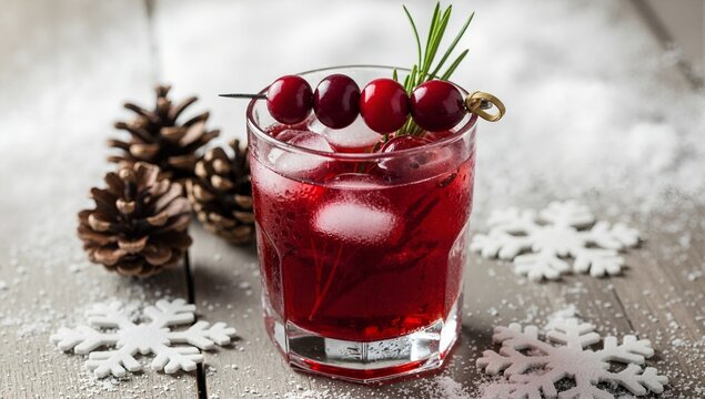 Close up of a festive red holiday cocktail with a cranberry garnish. A traditional Christmas winter drink on a rustic wooden background with snow and pinecones