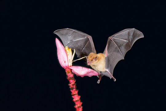 Orange nectar bat (Lonchophylla robusta) hovering and drinking nectar from a wild red banana flower (Musa velutina) in the rain forest, Costa Rica
