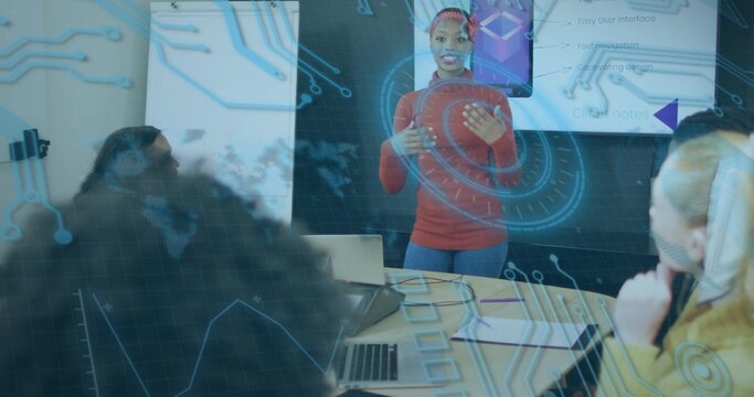 Woman leading meeting discussion with digital hud overlay and modern collaborative workspace
