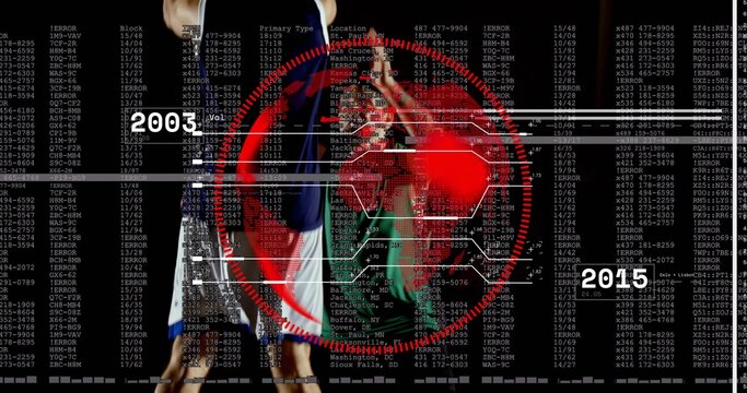Female basketball players defending player holding ball with augmented reality hud overlay