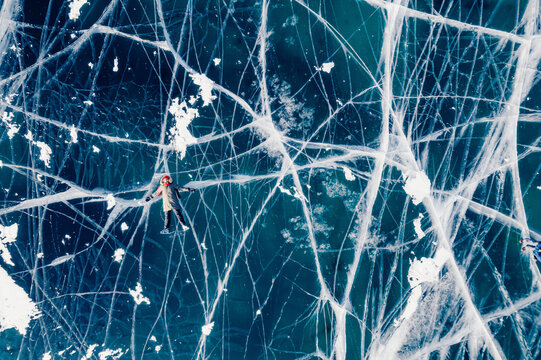 Woman tourist on ice skates and with long red scarf on frozen cracks lake Baikal, aerial top view