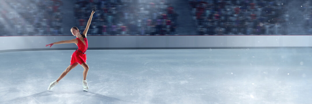 full length of figure skater in red dress performing camel spin in professional ice arena