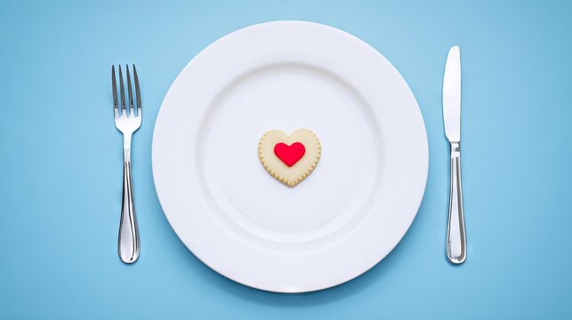 Heart-shaped cookie with red icing placed on a white plate, surrounded by silver cutlery, against a light blue background, symbolizing love and affection in culinary art