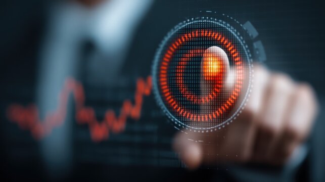A finger touching a glowing red interface with a fingerprint scan on a high-tech screen, illustrating digital security and advanced verification technology.