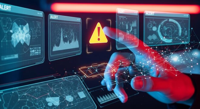 Digital Hand Engages with a Critical System Alert on a Futuristic Blue and Red Interface.