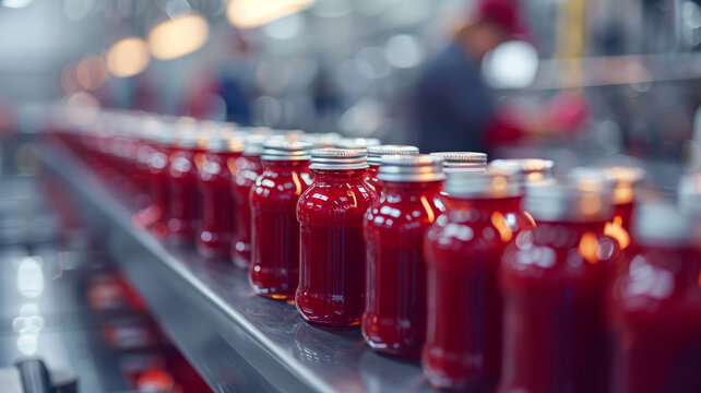 Bottles of red juice on a conveyor belt in a factory