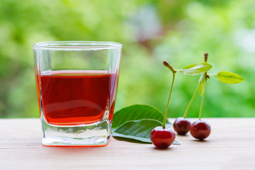 View on a glass with red juice and a cherries with leaf on a wooden board on a background of green garden in blur. Summer concept (copy space, shallow depth of field)