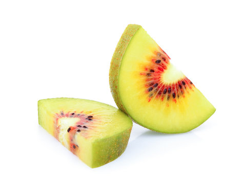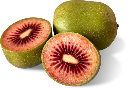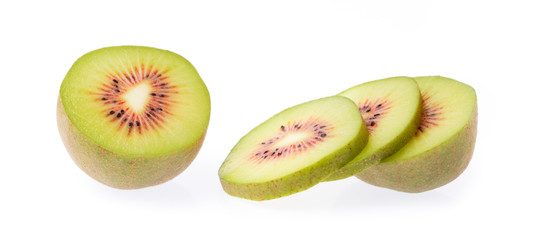 Red kiwifruit and red kiwi slices on white background. File contains clipping paths.