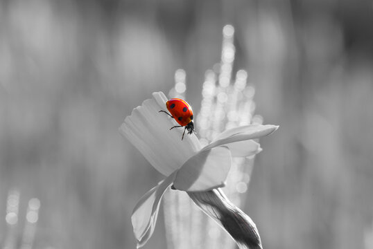 Red ladybug climbing up the stem of a yellow flower on gray background