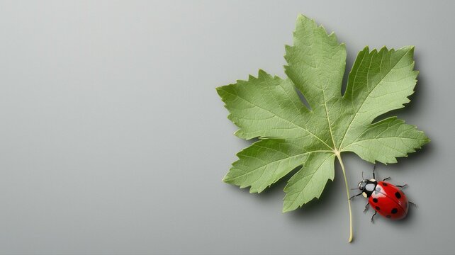 Fresh green leaf with vibrant red ladybug on neutral gray background symbolizing nature's beauty and simplicity.