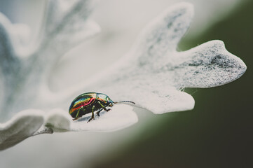bug on a leaf. ladybug on a leaf. close-up of a bright insect on a gray leaf. macro insect.