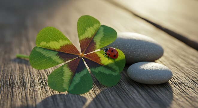 Four-leaf clover with ladybug and smooth stones on a rustic wooden surface in sunlight.