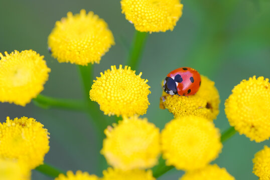 Red Beautiful Ladybug On The Grey Tree Twig On The Background Of Green Leaves Tiny Ladybird On The Dried Tree Branch