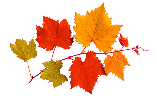 Abstract colorful of grape leaves color gold, red and orange with branch, autumn leaf transition, season change, isolated on white background with clipping path. Decoration design, holidays concept.