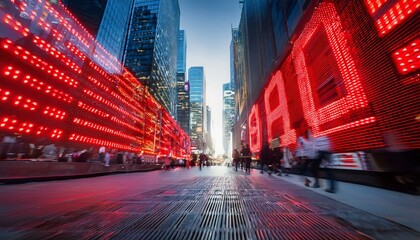 Red LED display showing numbers in a busy city street. A futuristic and modern look. Great for business and technology concepts