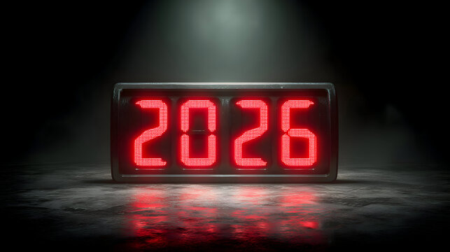 Digital display showing year 2026 in bright red LED lights, creating modern and futuristic atmosphere. glowing numbers stand out against dark background, evoking anticipation