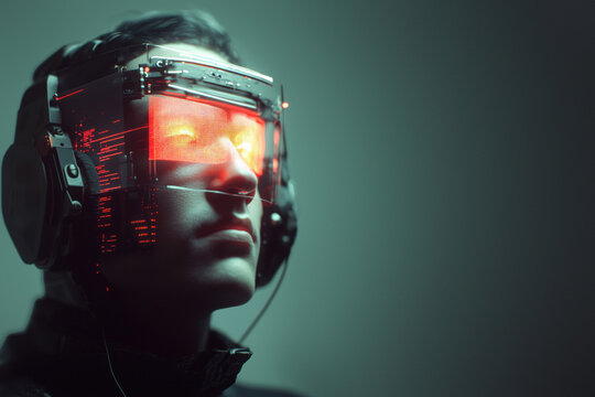 Futuristic woman wearing transparent ar visor over cyan holographic grid tech portrait