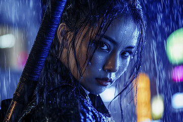 Cyberpunk warrior in neon reflective shard armor with visored helmet and spiked pauldrons