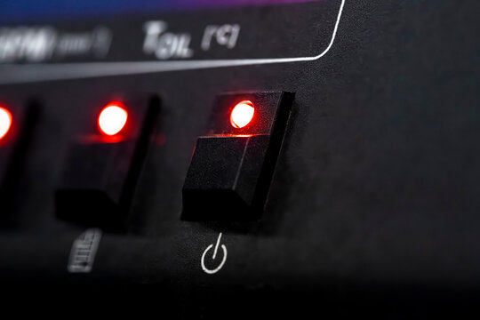 Close-up of illuminated red LED indicator lights and power button on automotive diagnostic equipment panel