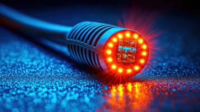 Futuristic microchip with glowing red LEDs integrated in highly detailed circuit board, representing advanced technology and innovation.