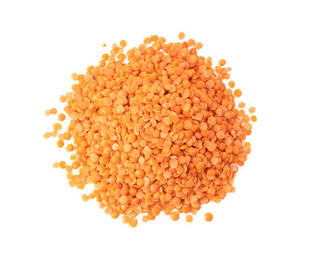 Raw uncooked red lentils (lens culinaris) in wooden bowl. Top view with copy space