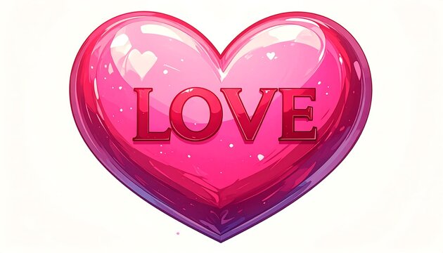 A glossy pink heart, center stage against a white background, displays the word "LOVE" in bold red lettering. The image has a cartoon-like aesthetic