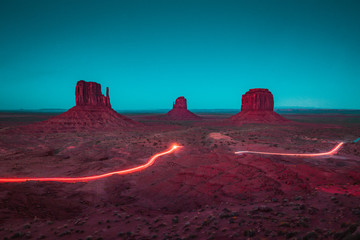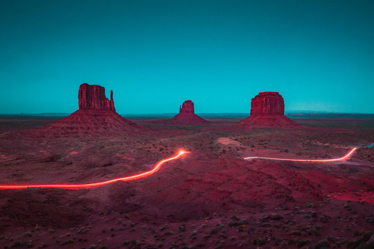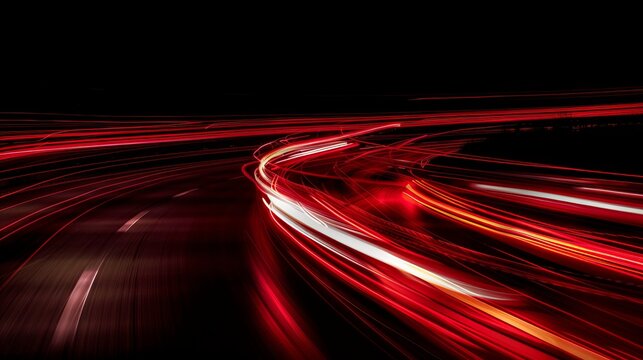 A long exposure photo of red light trails from cars driving on an empty highway at night