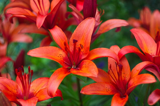 Red lily blooms in the spring in the garden. Big red lily flower close-up, macro.Beautiful red blooming lily in macro.