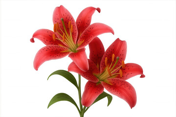Red lilies blooming, speckled petals spreading, verdant leaves framing elegant floral composition on clean white backdrop