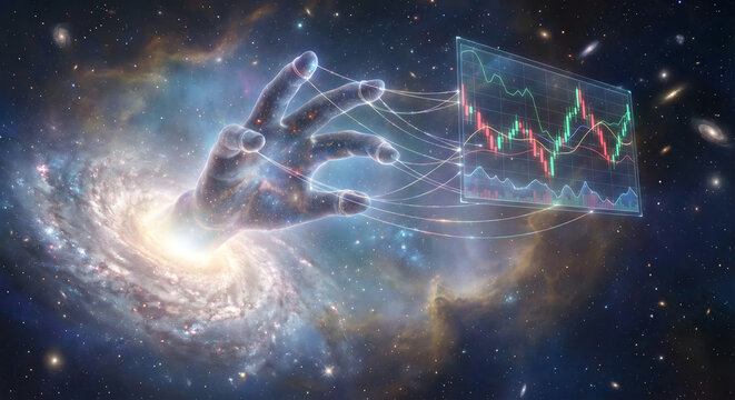 A cosmic hand reaching towards a glowing holographic financial chart in space