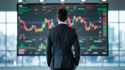 A sharply dressed businessman, viewed from behind, stands in a modern office, looking at a large wall-mounted screen displaying a complex financial graph with red and green lines