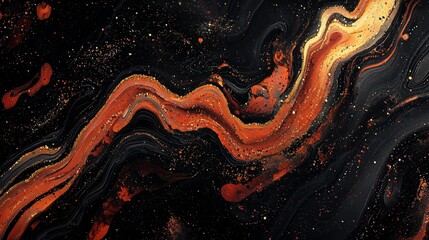 Abstract Art Featuring Swirling Marbled Pattern with Bold Flowing Orange and Red Lines Against Deep Black Background with Intricate Gold Speckles and Shimmering Details