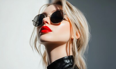 Fashionable woman with red lipstick and sunglasses on abstract background