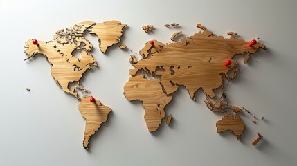 A detailed world map with multiple red push pins marking different locations, symbolizing travel plans, exploration, or data points
