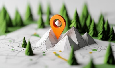 Low-poly map with red and orange pins on abstract green hills and trees