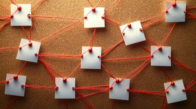 Corkboard with multiple blank white squares connected by red strings and red push pins illustrating network or connections