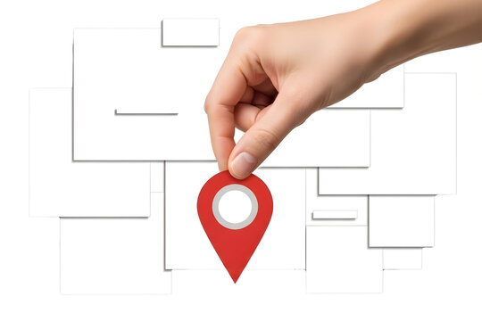 Hand holding red map pin over abstract map outline isolated on transparent background