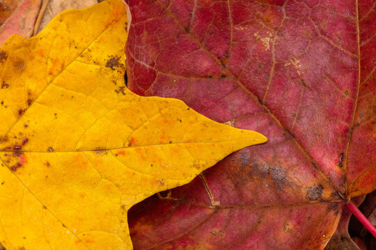 Overlapping autumn maple leaves, contrasting the yellow with the red, lay on the ground within the Pike Lake Unit, Kettle Moraine State Forest, Wisconsin