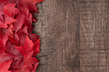 Fall color nature background, red maple leaves on a rustic dark wood background