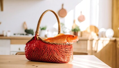 Fresh fish in a red mesh basket on a wooden table in a kitchen