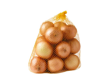 A group of fresh brown onions packed inside a red mesh net bag, isolated on a white background. The onions have smooth, papery skins with natural textures and subtle color variations. The net bag is t