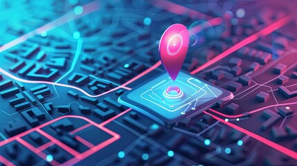 Bright red navigation pin glowing over a dark tech city grid.