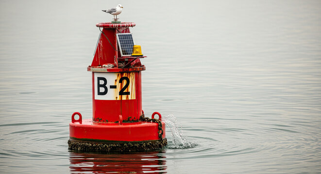 Vibrant red buoy bobbing gently on a calm ocean surface, sunlight reflecting off its polished surface  A tranquil scene of nature's beauty and nautical markers , buoy, nautical